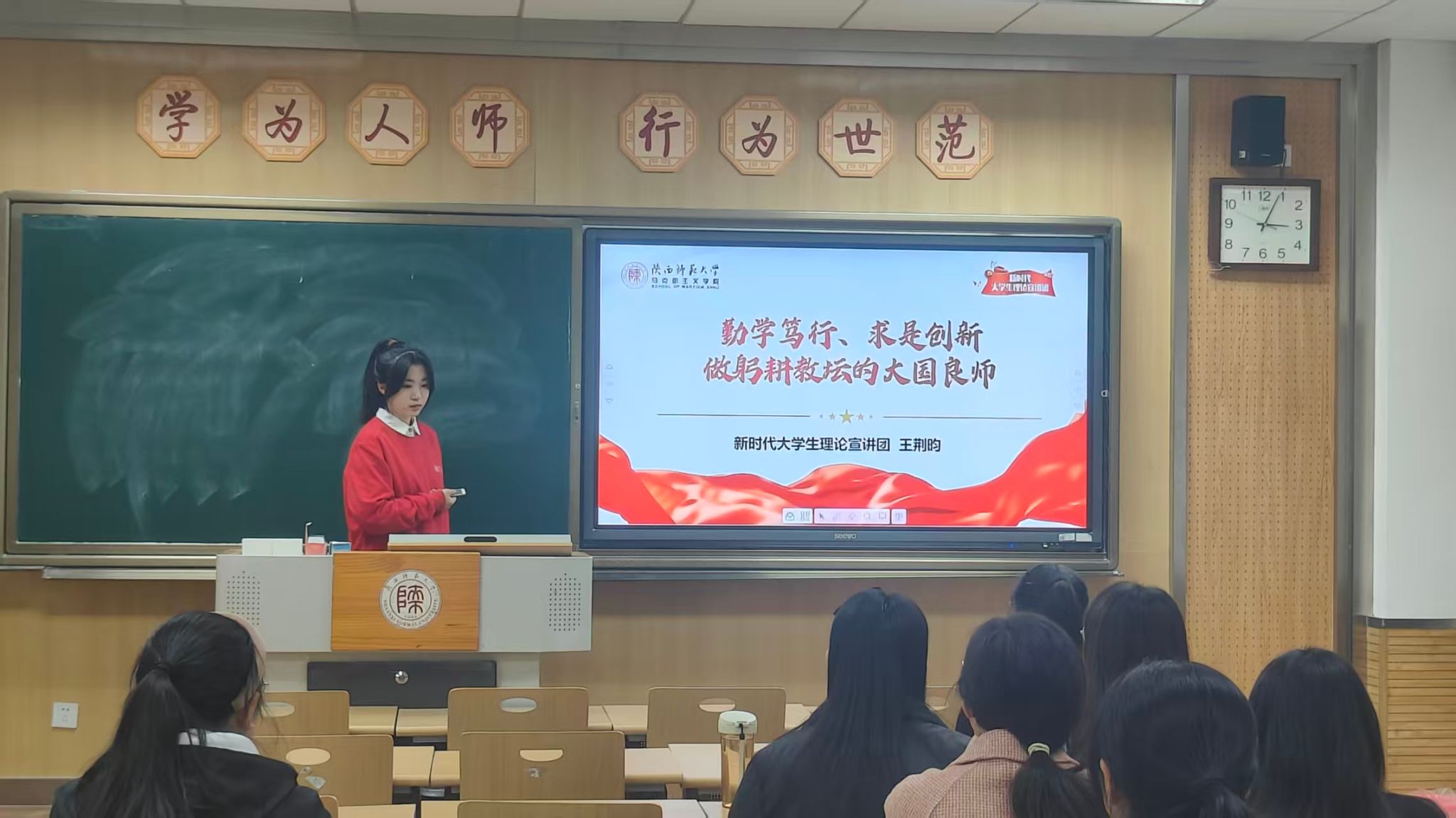 活动伊始,马克思主义学院新时代大学生理论宣讲团王荆昀同学围绕“教育家精神”进行了深入宣讲,阐释了新时代教育者的使命担当。接着,历史文化学院“史原星火”大学生理论宣讲团孙佳怡同学聚焦《可爱的中国》,深情讲述从方志敏烈士笔下的理想愿景到当今时代“可爱的中国”的生动实践与精神传承。