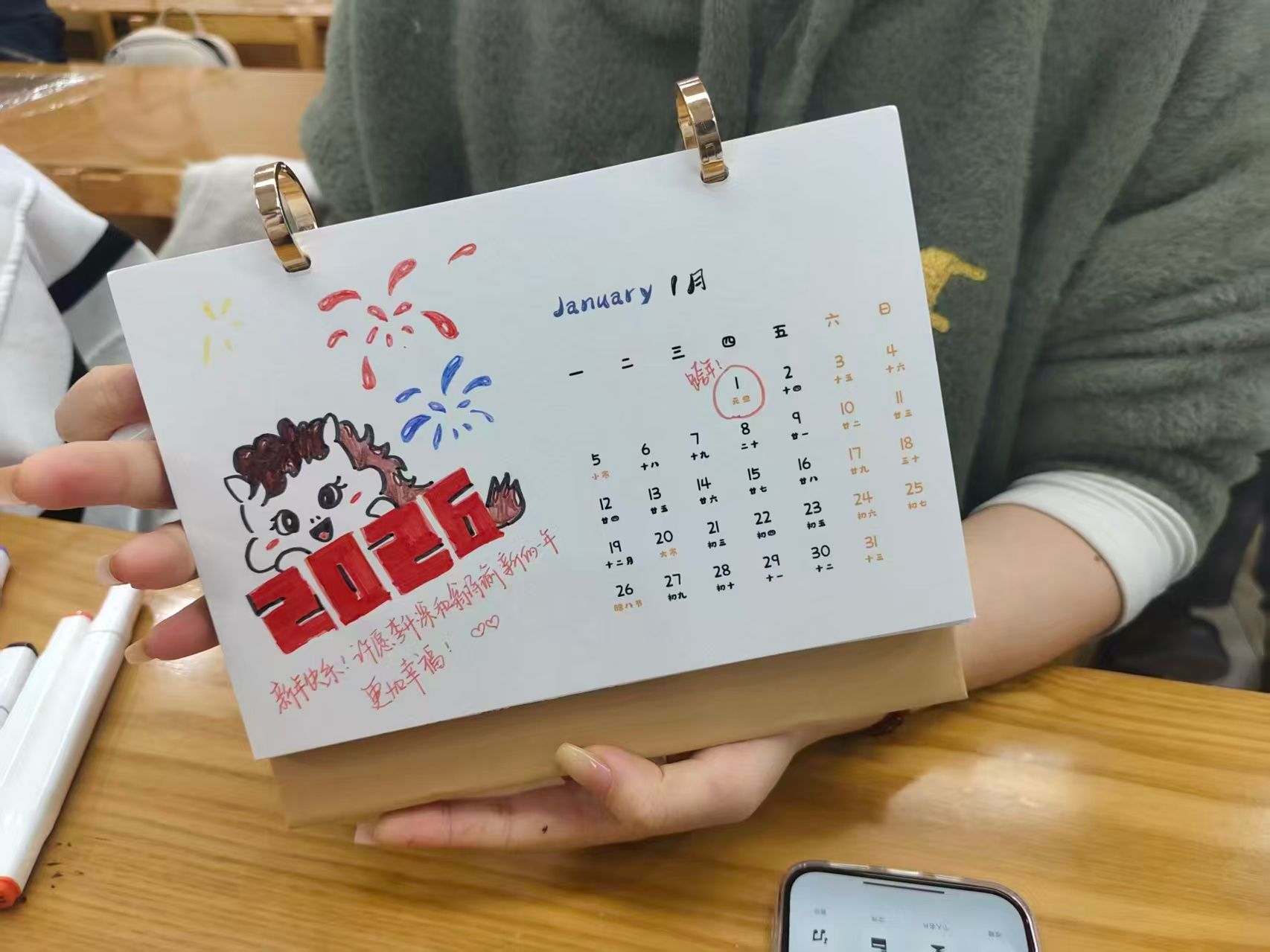一张张手绘台历,既是同学们对过往时光的温柔梳理,也是对新年的热切期盼。"文汇听心"二级心理辅导站将持续以创意心理活动为载体,通过绘画、手工等多元形式,为同学们搭建释放情绪、表达自我的平台,让大家以更积极的心态迎接新一年的晨光,让心理健康的暖意伴随元旦的钟声,融入校园的每一个角落。