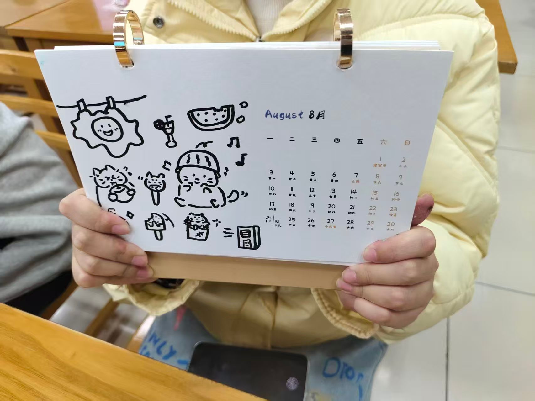 活动现场,心理辅导站工作人员为参与同学分发空白台历、颜料画笔等创作材料,同学们各展巧思:有人用缤纷贴纸装点台历页面,有人将动漫角色、自然植物等喜爱的元素融入绘画,更有人把对新年的憧憬与祝福化作文字,一笔一划写在台历的日期旁。手绘台历的过程,让同学们沉浸在创作的愉悦里,卸下内心的重负,也让每一本台历都成为承载个人心意、独一无二的新年信物。