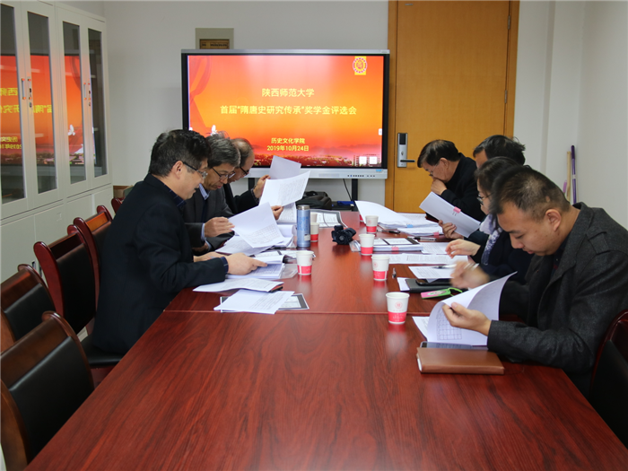 2019年10月24日下午14:30,历史文化学院于文汇楼C段207会议室召开陕西师范大学首届“隋唐史研究传承”奖学金评审会议。“隋唐史研究传承”奖学金评审委员会成员杜文玉、薛平栓、王双怀、拜根兴和介永强,学院党委副书记程蕾以及研究生兼职辅导员张兴浩参加会议。