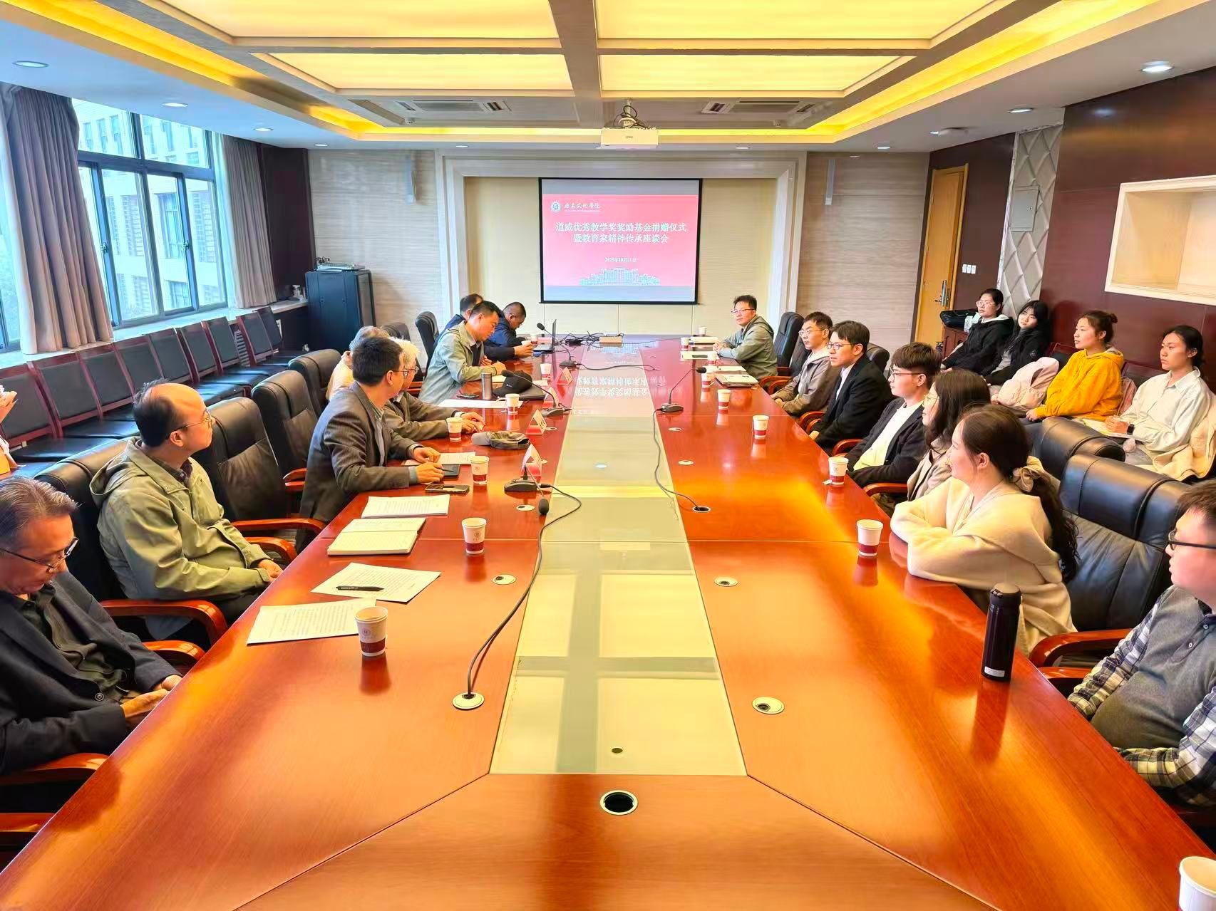 2025年10月31日下午,历史文化学院道威优秀教学奖奖励基金捐赠仪式暨教育家精神传承座谈会在文汇楼A段409会议室顺利举行。道威优秀教学奖奖励基金捐赠者、历史文化学院赵世超教授,萧正洪教授、学院党政班子成员、各系系主任、青年教师代表及学生代表参加了座谈会,座谈会由历史文化学院院长李化成主持。