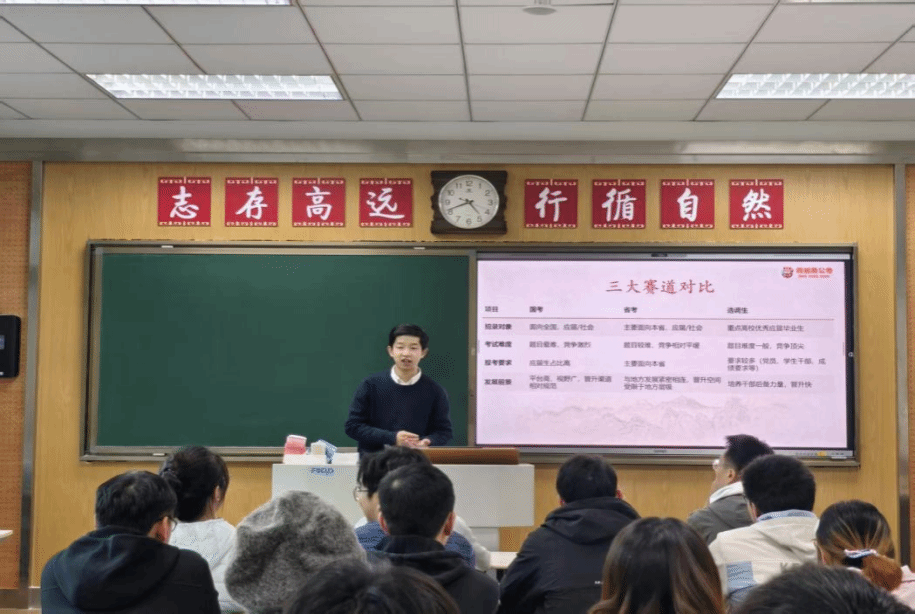 活动开始,主持人汪静首先对马瑶老师、主讲嘉宾及到场的同学们表示欢迎,随后邀请杨鸿睿老师上台讲解考公考情及备考规划。杨鸿睿老师首先介绍了国考、省考和选调生考试三大赛道,从招录对象、考试难度、报考要求和发展前景四方面阐述了各个考试的不同之处。他建议各位同学发挥自身优势,合理选择报考方向。