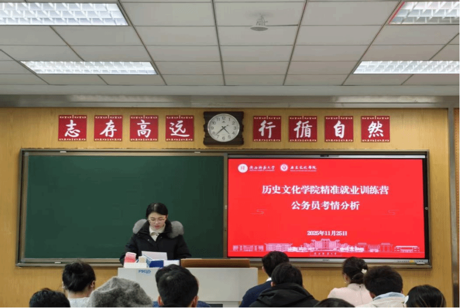 为加强精准就业指导,深化硕士研究生对公务员考情的相关认知,2025年11月25日下午,历史文化学院于文渊楼3211教室举办第二十期精准就业训练营——公务员考情分析会。参加本次活动的有历史文化学院研究生辅导员马瑶,青淞果公考研究院的首席讲师杨鸿睿,以及历史文化学院部分研究生同学。本次活动由研究生会干事汪静主持。
