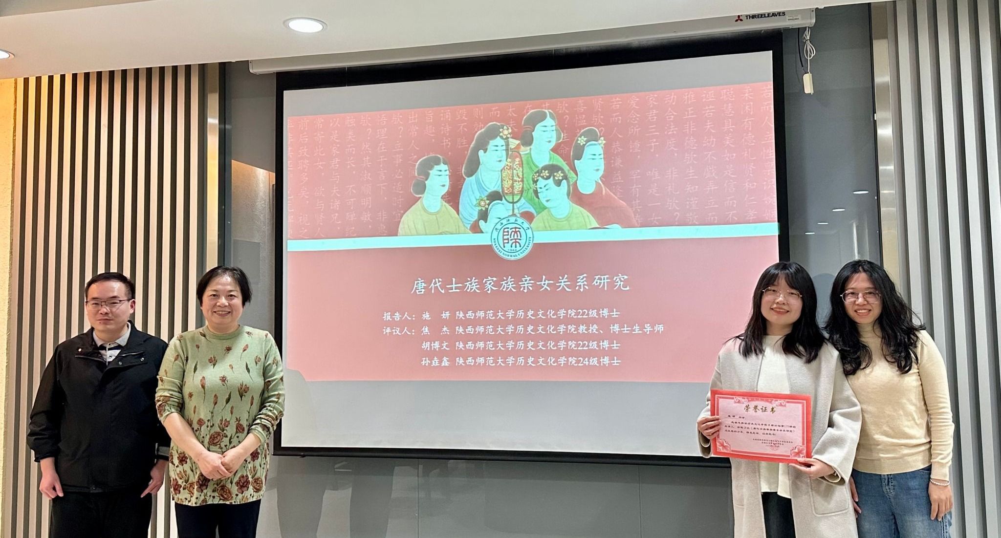 2025年11月5日,历史文化学院研究生“日新论坛”第一百七十七讲在长安校区文汇楼C段424会议室举办。本次论坛的主题为《唐代士族家族亲女关系研究》,主讲人为我院2022级博士研究生施妍。我院焦杰教授、2022级博士研究生胡博文及2024级博士研究生孙垚鑫对其进行评议。论坛由研究生会学术部杨晓萍同学主持。