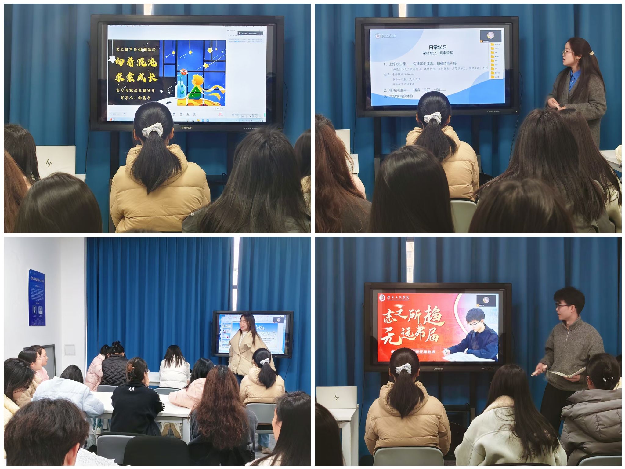 为提升历史学专业素养,深化师范生身份认知,12月21日,第四十八期“文汇新声”活动开展以“师路起航,育见未来”为主题的交流分享会。活动邀请我院向嘉乐、赵海彤、赵子娟、谢志豪四位同学,结合自身实习经历,分享师范生实践过程中的宝贵经验与深刻感悟。