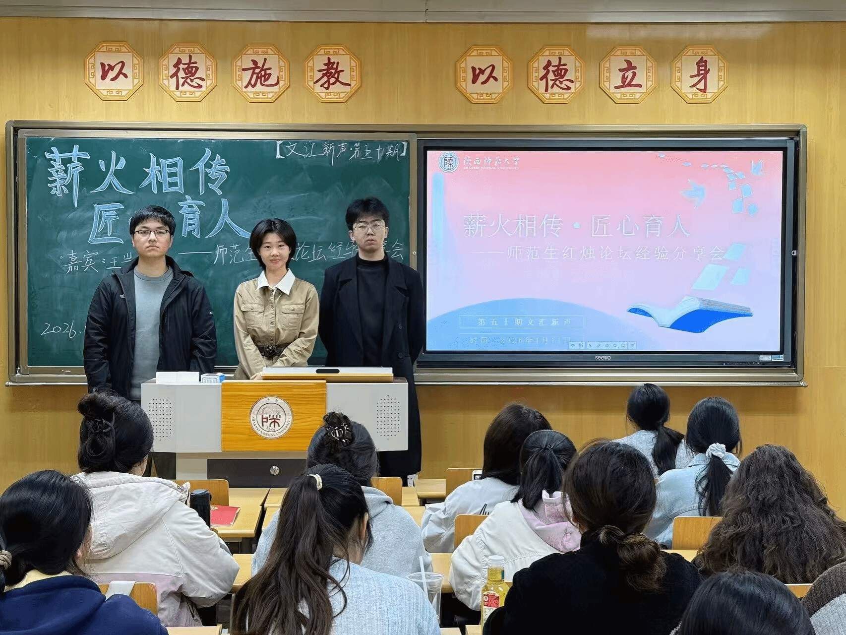 为提升学院师范生师范教学技能,激发学生红烛论坛参与热情,4月11日,第五十期“文汇新声”活动开展以“薪火相传·匠心育人”为主题的交流分享会。活动邀请我院周俊、邵靖雯、王岩三位同学,结合自身红烛论坛参与经历,分享师范生竞赛实践过程中的宝贵经验与深刻感悟。