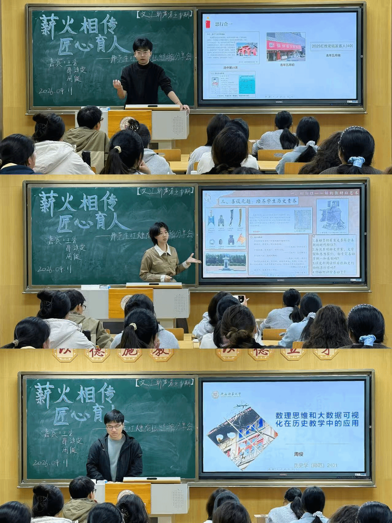 经验分享环节,周俊结合红烛论坛参会经历,就自身成果内容、写作过程、和选题方法做了详细介绍,建议同学们从社会发展趋势入手,从实践中选题参赛并鼓励大家大胆行动;邵靖雯从家校情境切入,就教师教学“创新性”、“关怀性”与“表现性”三个维度展开分享,并激励大家从确定性、专业性与持续创新性三方面积极应对数字化时代的历史教学;王岩系统地介绍了红烛论坛的基本情况与参会流程,并从“思行合一”方面介绍了自己的参赛经验,鼓励大家要勇于为自己的内心表达。