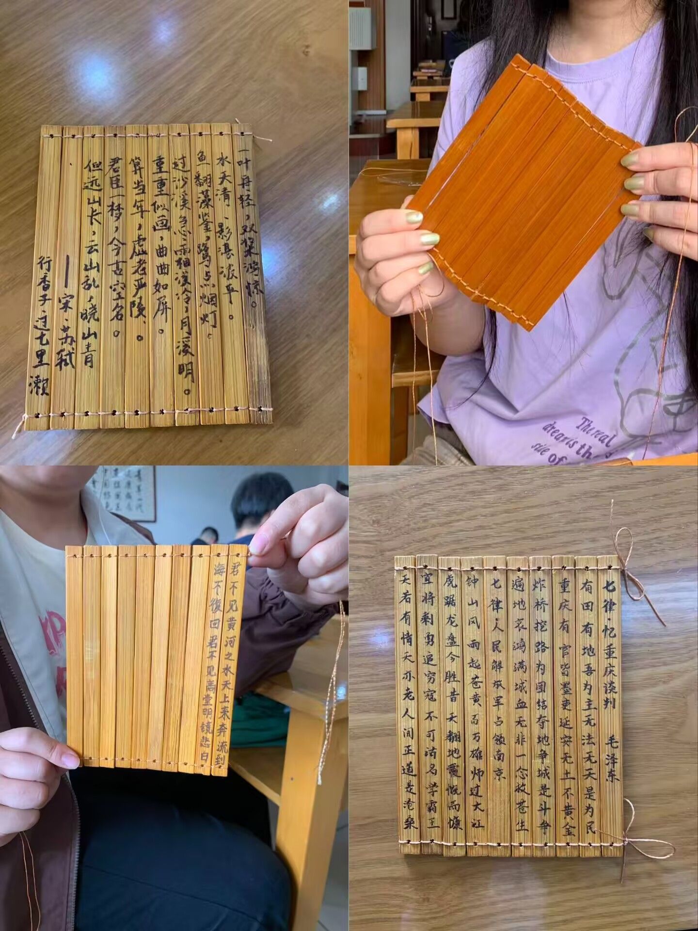 活动现场,心理辅导站为每位参与者准备了竹片、麻绳、笔等材料,并额外配备剪刀等工具以确保活动流畅进行。活动开始后,辅导站成员简要讲解了竹简的历史背景与制作技艺,展示制作教程,引导同学们以墨传情、以竹载文。大家相互协作,交流制作技巧,分享书法心得,活动现场温馨而有序,同学们制作出了许多精美的竹简作品。
