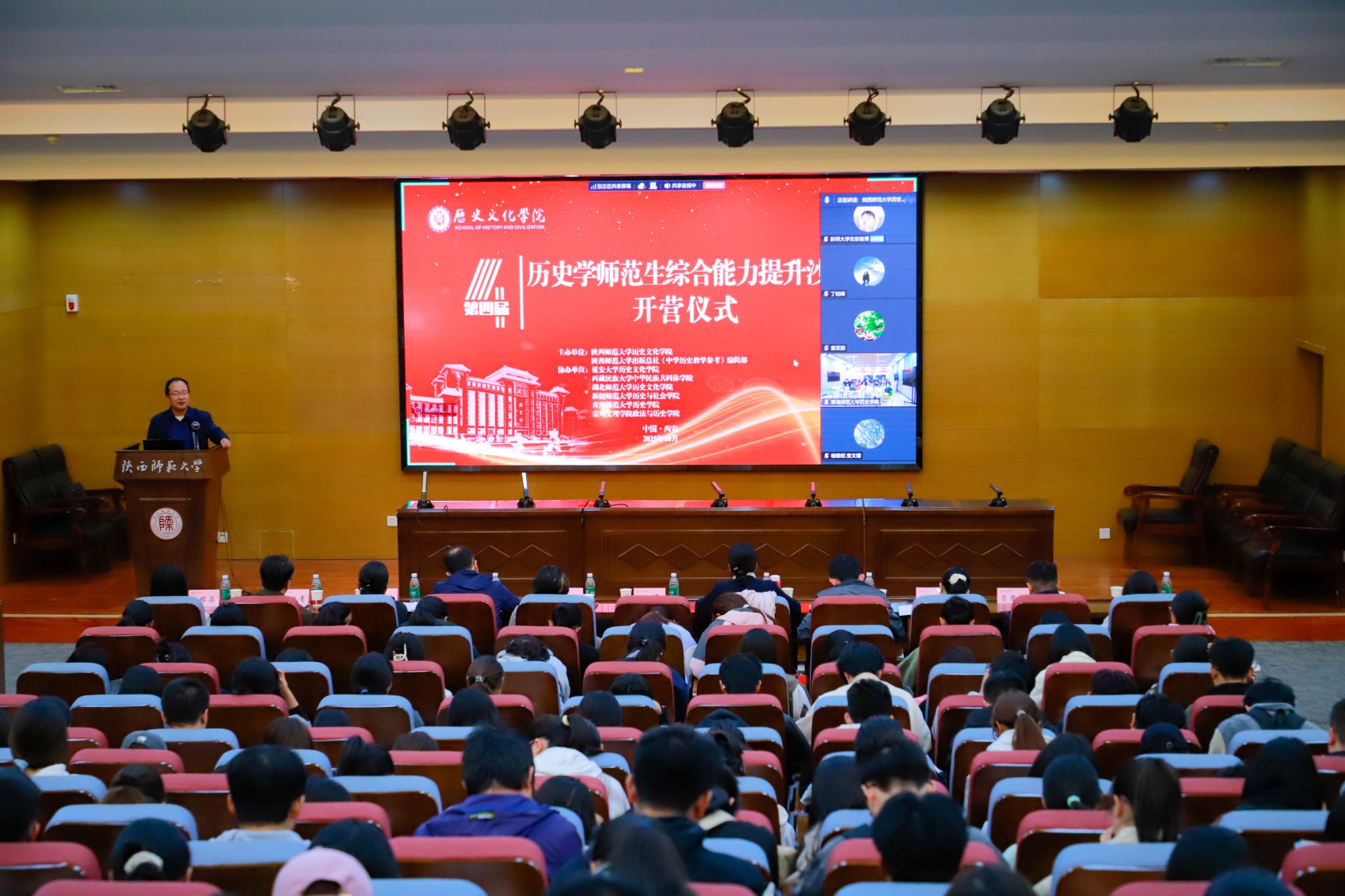 10月17日,第四届陕西师范大学历史学师范生综合能力提升沙龙开营仪式在我校文汇楼C段211报告厅举行。活动由我校历史文化学院、《中学历史教学参考》编辑部主办,延安大学历史文化学院、西藏民族大学中华民族共同体学院、湖北师范大学历史文化学院、新疆师范大学历史与社会学院、青海师范大学历史学院、宝鸡文理学院政法与历史学院协办。学院副院长郭响宏、刘旭辉,学科教学论蔡娜副教授,基础教学实验中心副主任苏争艳副教授,团委书记孙懿文,各年级辅导员及沙龙活动小组代表近300人在线下参会。6所兄弟高校的师生代表在线上参会。会议由郭响宏副院长主持。